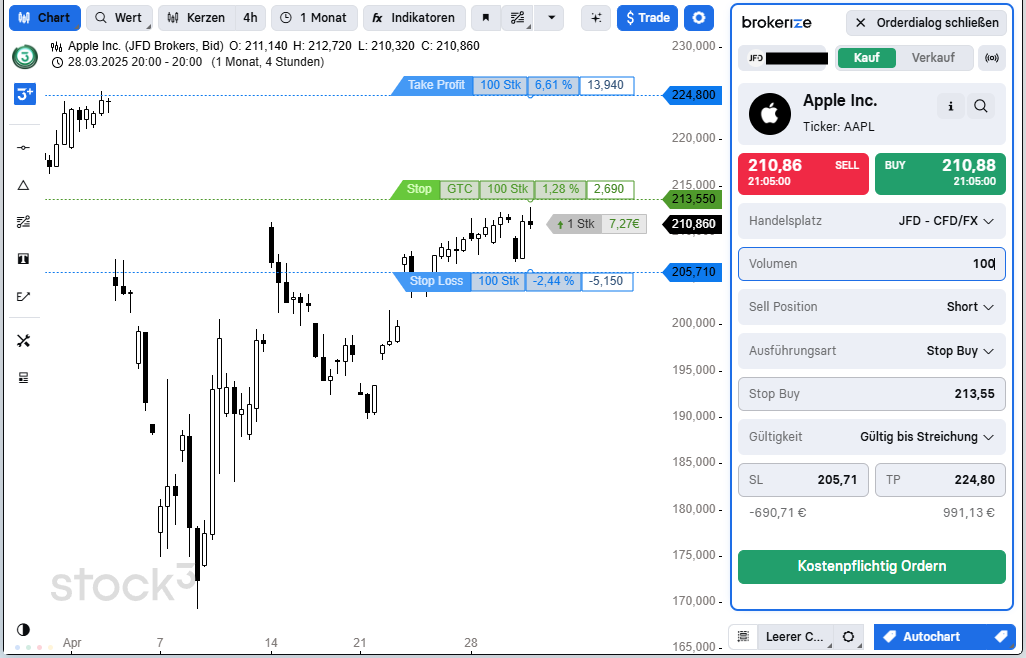 Auch die Orderaufgabe und das Management bestehender Positionen direkt über das stock3 Charting bieten wir für alle angebundenen CFD-, Online - und Neo-Broker an.