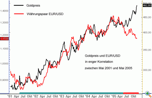 Ein häufig vernachlässigtes Problem bei der Ermittlung des Kapitalrisikos der Position ist die Korrelation der unterschiedlichen gehandelten Märkte oder der verschiedenen Aktien. Die Aktienmärkte entwickeln sich beispielsweise insgesamt übergeordnet einheitlich. Kommt es zu einer umfassenden mittelfristigen Rallye im deutschen Aktienindex DAX, entwickeln sich die meisten der darin enthaltenen Papiere positiv. Einige Aktien steigen stärker, einige steigen weniger stark, die wenigsten darin enthaltenen Aktien werden aber während der Rallye eine negative Kursentwicklung aufweisen. Genauso verhält es sich auch eine Ebene höher. Wie in den vergangenen Jahren erfolgt, entwickeln sich die europäischen Märkte tendenziell in Anlehnung an den US Markt. Wenn Dow Jones und S&P 500 einbrechen, können sich dieser Entwicklung DAX und Eurostoxx ebenfalls kaum entziehen. Korrelationen gibt es darüber hinaus auch in allen anderen Märkten. Wenn der Ölpreis-Future nachhaltig steigt, springen tendenziell auch die Futures für Benzin und Heizöl an. Einem steigenden Goldpreis kann sich auch der Preis für Silber und Platin übergeordnet kaum entziehen, ebenso entwickelt sich Sojabohnen Öl tendenziell genau so wie Sojabohnen Mehl. Auch über die verschiedenen beispielhaft benannten Marktsegmente hinaus entwickeln sich teilweise über lange Zeiträume wichtige Korrelationen. Im folgenden Beispiel ist die Entwicklung des Goldpreises der vergangenen Jahre der Entwicklung des Währungspaares EUR/USD (Euro gegenüber dem US Dollar) im gleichen Zeitraum gegenüber gestellt.