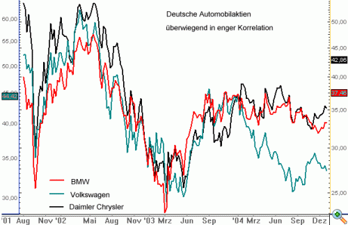 Erkennbar ist hier über einen Zeitraum von Mai 2001 bis Mai 2005 eine tendenziell enge Korrelation dieser beiden völlig unterschiedlichen Märkte. Während der Goldpreis sich ausgehend von einem Kursniveau um 250 $ erholen konnte und in diesem Zeitraum bis auf 450 $ anstieg, gab es im Währungspaar EUR/USD eine umfassende Rallye aus dem Bereich 0,85 $ bis auf 1,35 $. Erkennbar ist, dass auch die mittelfristigen Kursbewegungen tendenziell ähnlich abgelaufen sind. Mittelfristige Hochs und Tiefs wurden in beiden Märkten zu annähernd gleichen Zeitpunkten ausgebildet. Seit Mai 2005 bricht diese Korrelation jetzt aber auf. Der Goldpreis kann die Rallye auf neue Hochs fortsetzen währen das Währungspaar sich in einer umfassenden Korrektur befindet. Im Zeitraum der Korrelation der beiden Märkte konnte der Trader eine Position bei Gold nicht eingehen, ohne auf die Entwicklung beim EUR/USD zu achten. Das Aufbrechen der Korrelation bedeutet jetzt nicht zwangsläufig, dass sich die Märkte weiter gegensätzlich bewegen werden, die weitere Kursentwicklung dürfte jetzt aber unabhängiger voneinander sein. Der Trader muss die beiden Märkte jetzt in jedem Fall nicht mehr zwingend in Bezug zueinander setzen. Korrelationen gibt es darüber hinaus vor allem auch im kleineren Kreis der unterschiedlichen Marktsegmente und Sektoren des Aktienmarktes. Diese müssen für Tradingentscheidungen gerade bei Aktien zwingend berücksichtigt werden. Am folgenden Beispiel in Abbildung 25 ist die Entwicklung der Aktien von DaimlerChrysler, Volkswagen und BMW dargestellt. Diese Wertpapiere sind alle im Deutschen Aktienindex DAX enthalten und kommen aus dem Automobilsektor.