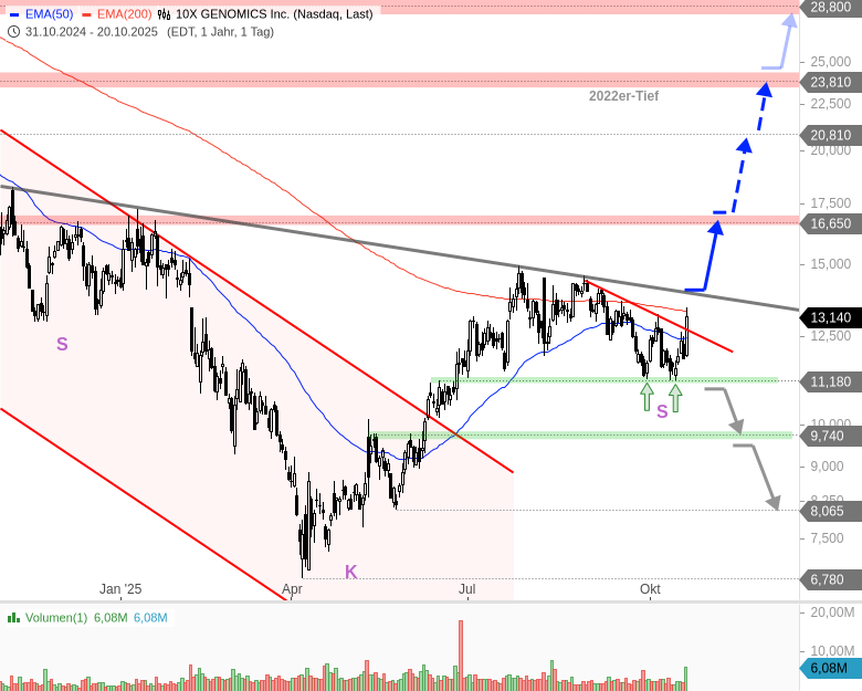 Im April markierte die Aktie ihr Allzeittief und beendete den mehrjährigen Abwärtstrend. Eine kräftige Erholung ließ den Wert bis in den Bereich des EMA200 ansteigen, wo seit dem Sommer eine Konsolidierung läuft. Gestern kam es zu einer massiven Kaufwelle, unter hohen Handelsumsätzen wurde das Papier nach oben geschoben. Der Impuls kam durch die Meldung einer Kooperation mit dem KI-Spezialisten Anthropic bekannt gab. Mit der Integration der Analysewerkzeuge für Einzelzell- und räumliche Biologie von 10x in die Plattform "Claude for Life Sciences" von Anthropic soll Wissenschaftlern der Zugang erleichtert werden. Analytische Aufgaben wie Read-Alignment, Clustering und andere Analysen sollen über eine dialogorientierte Benutzeroberfläche erleichtert werden.