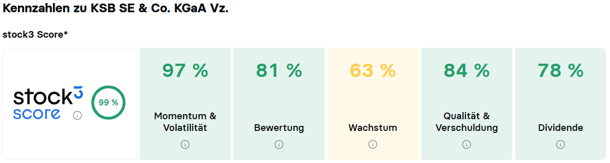 Nach wie vor schneidet die KSB-Vorzugsaktie in der vollautomatischen Auswertung des stock3 Scores mit 99 % extrem gut ab. Verantwortlich dafür sind vor allem ein hohes Kursmomentum, eine günstige fundamentale Bewertung, eine hohe Bilanzqualität und eine attraktive Dividende.