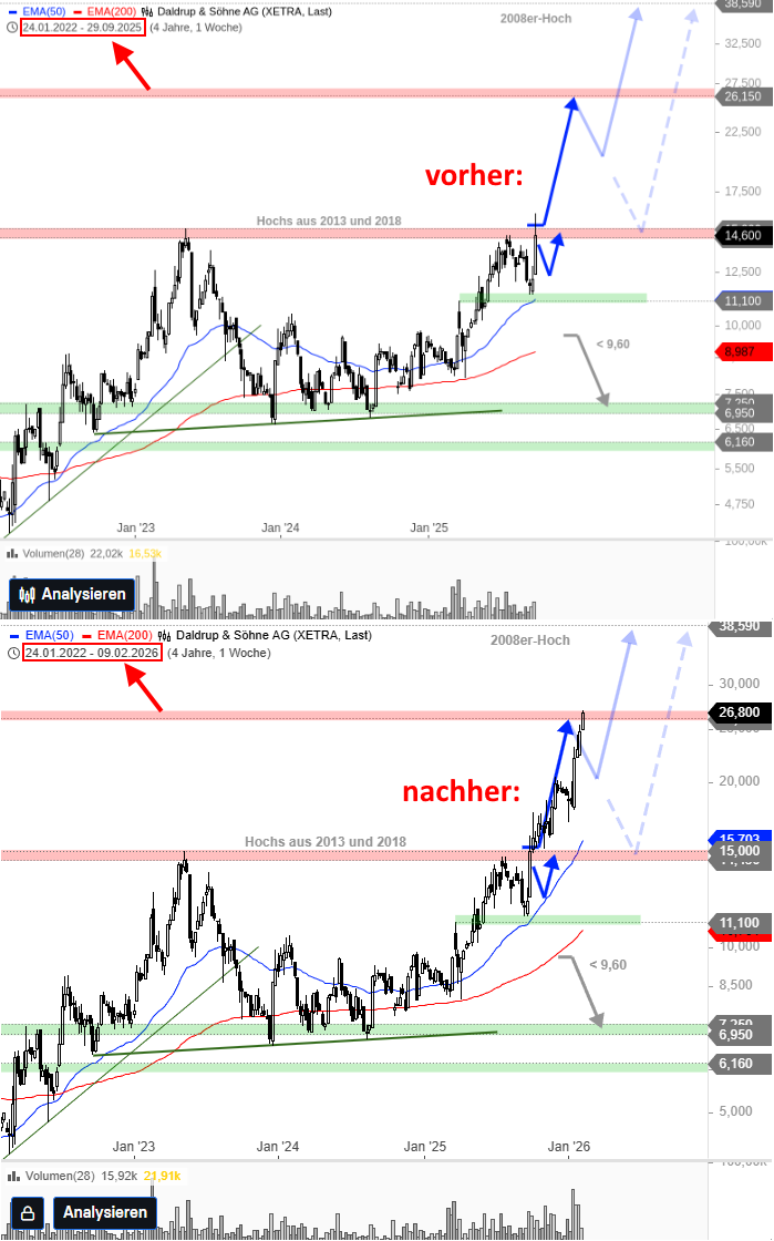 Die Zahlen von Daldrup & Söhne lieferten den entscheidenden Impuls, die Charttechnik direkt im Anschluss das Handelssignal. Auf dieses wurde genau im richtigen Moment hingewiesen. Die Analyse erschien am 1. Oktober 2025 exklusiv für unsere Plus-Leser. Teste auch Du unser Plus-Paket, jetzt sogar mit 10 % Rabatt: