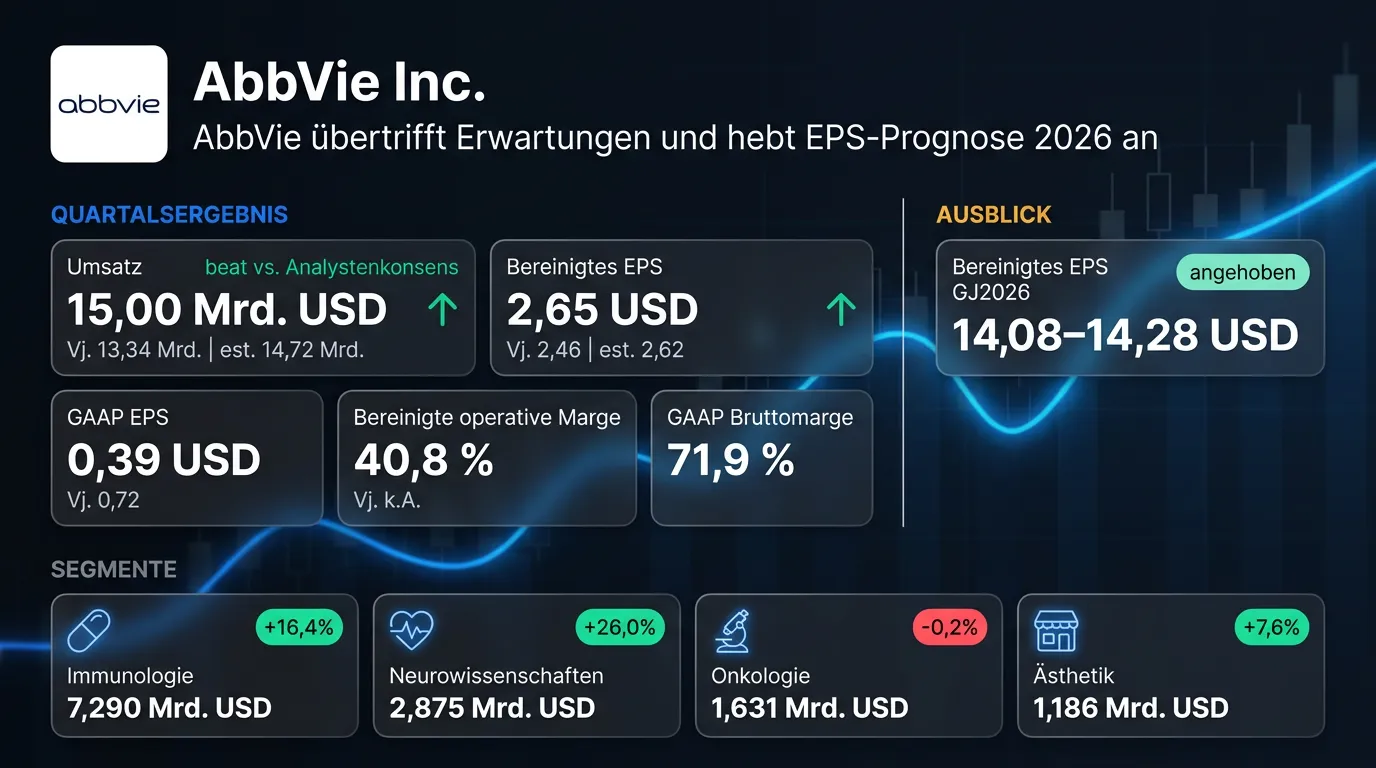 AbbVie hat im ersten Quartal 2026 einen Nettoumsatz von 15,00 Mrd. USD erzielt und damit sowohl die Analystenerwartungen als auch das Vorjahresergebnis deutlich übertroffen. Das bereinigte EPS stieg um 7,7 Prozent auf 2,65 USD und lag über dem Analystenkonsens von 2,62 USD. Wachstumstreiber waren vor allem die Immunologie-Sparte mit Skyrizi (+30,9 %) und Rinvoq (+23,3 %) sowie das Neurowissenschafts-Portfolio mit einem Plus von 26,0 Prozent. AbbVie hebt die bereinigte EPS-Guidance für das Gesamtjahr 2026 von 13,96–14,16 USD auf 14,08–14,28 USD an. Der GAAP-Gewinn je Aktie lag mit 0,39 USD deutlich unter dem Vorjahr, belastet durch erworbene IPRD- und Meilensteinaufwendungen von 0,41 USD je Aktie.