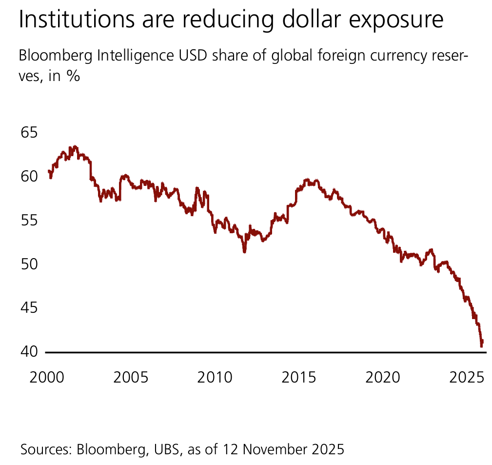 Der "Bloomberg Intelligence USD share of global foreign currency reserves (in %)" ist von über 60% um das Jahr 2000 herum auf nur noch knapp über 40% im Jahr 2025 gefallen, ein Tiefpunkt in der modernen Finanzgeschichte. Dies markiert einen fundamental beschleunigten Trend der De-Dollarisierung, bei dem Institutionen ihre Dollar-Exposure massiv reduzieren. Der Rückgang von 2015 bis 2025 ist dabei besonders steil und spiegelt die aktuelle tektonische Verschiebung im globalen Finanzsystem wider.