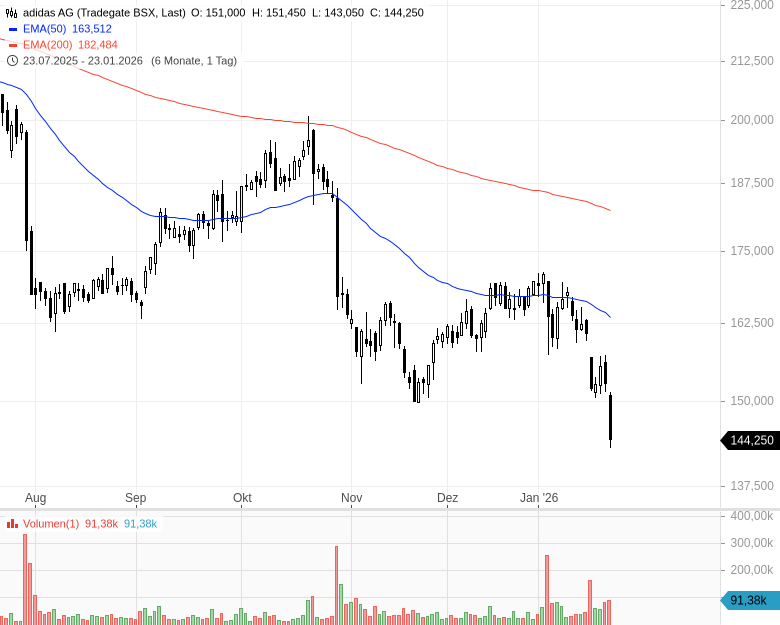 Die kanadische Investmentbank RBC Capital Markets hat das Kursziel für adidas von 190 auf 160 EUR gesenkt und die Einstufung von "Outperform" auf "Sector Perform" zurückgenommen. Analyst Piral Dadhania begründete den Schritt mit begrenzten Kurstreibern und zu hohen Konsensschätzungen für das Geschäftsjahr 2026.