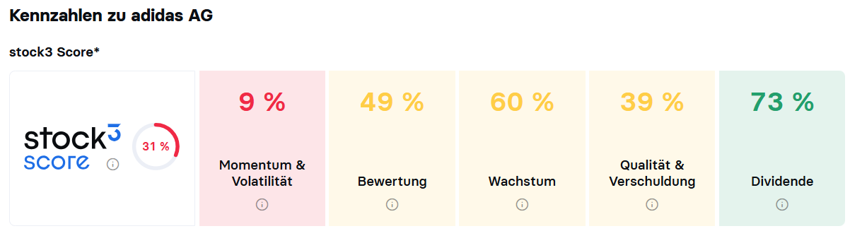Fazit: Sollte sich das erwartete Wachstum im laufenden und im kommenden Jahr manifestieren, ist die adidas-Aktie alles andere als teuer. So liegt das Kurs-Gewinn-Verhältnis (KGV) auf Basis der Schätzungen für das aktuelle Jahr nur bei 13 und für 2027 sogar nur bei 11. Im historischen Vergleich und im Verhältnis zum erwarteten Wachstum ist das günstig. Gleichwohl befindet sich die Aktie in einem intakten Abwärtstrend, was durch den heutigen Rutsch auf das neue Mehrjahrestief einmal mehr bestätigt wurde. Im stock3 Score kommt die adidas-Aktie aktuell nur auf eine unterdurchschnittliche Einstufung von 31 %, was vor allem am negativen Kursmomentum liegt.