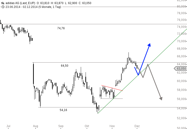 Im Oktober feierten die Käufer in der Adidas Aktie ein Comeback und konnten ihrerseits nach dem Fehlausbruch unter 54,16 Euro einen kurzfristigen Aufwärtstrend initiieren. Dieser führte die Aktie bis auf ein aktuelles Hoch bei 67,09 Euro, wo in den vergangenen Tagen Gewinnmitnahmen einsetzen und eine Korrektur ausgelöst wurde. Diese ist noch aktiv und könnte sich kurzfristig weiter ausdehnen. Da ein Toppmuster bisher aber fehlt, wird davon ausgegangen, dass die Käufer nochmals einen Anlauf nach oben wagen. Das erste Ziel hierfür liegt am bisherigen Hoch bei 67,09 Euro. Im Anschluss könnten die Käufer zudem versuchen, das noch offene Abwärtsgap vom 31. Juli komplett zu schließen.