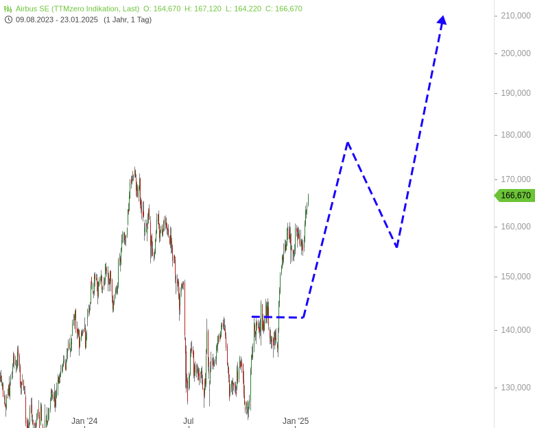 Seit Oktober 2022 steht Airbus in einem großen 2-Rallyphasenfraktal. Ich liebe diese Signalmuster, weil sie eine hohe Trefferquote haben. Sprich, die daraus abgeleiteten Prognosen erweisen sich erstaunlich häufig als richtig. Im zweiten Halbjahr 2024 konnte Airbus einen Dreifachboden ausbilden, aus dem der Aktienkurs seit November dynamisch nach oben ausbrechen kann: