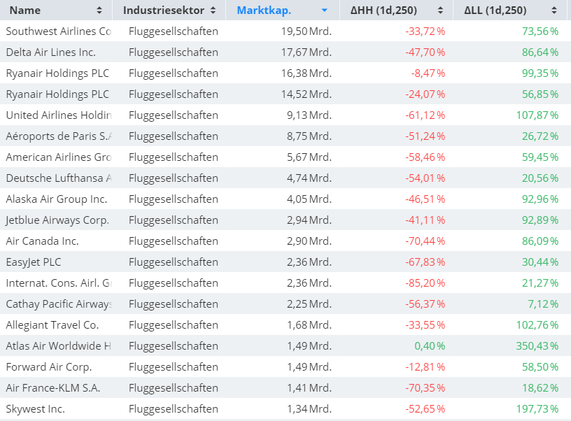 Der folgende Screenshot aus dem Guidants-Screener zeigt die wichtigsten Airline-Aktien. Die vorletzte Spalte zeigt, wie weit die Aktien derzeit unter ihrem Vor-Corona-Hoch (höchstes Hoch der letzten 250 Handelstage) notieren. Die letzte Spalte zeigt den Abstand zum Corona-Tief (dem tiefsten Tief der letzten 250 Handelstage).