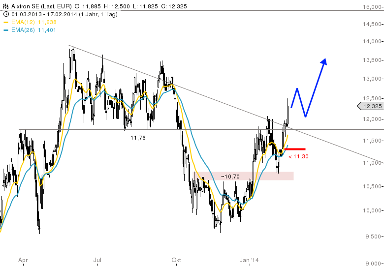 Über Wochen hin ringen die Käufer in Aixtron mit dem Widerstandsbereich bei 10,70 Euro, der am 07. Januar endlich nachhaltig überwunden werden konnte. Dies führte zu einem Pullback zurück an das Widerstandscluster um 11,76 Euro, wo sich die Bullen einer nächsten größeren Hürde gegenüber sahen. Unter diese alte Unterstützungszone fiel der Kurs im Oktober 2013 zurück und startete damit eine größere Verkaufswelle bis auf ein Tief bei 9,56 Euro. Das waren ausgehend vom vorangegangenen Hoch immerhin gute 30% an Wertverlust, bevor sich die Käufer wieder deutlicher zurückmelden konnten.