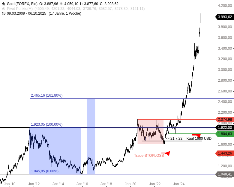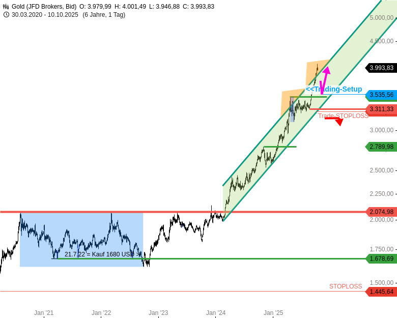 Ergänzung: Ursprünglich gab es mal einen Stoploss bei 1444 USD. Mittlerweile ist der Stoploss unter 3300 USD sinnvoll.