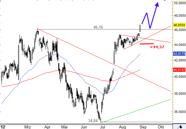 Die Aktie von Akzo Nobel bricht im heutigen Handel über den Widerstand bei 46,16 Euro nach oben aus. Damit steigt die Aktie auf den höchsten Stand seit Juni 2011 an. Dieser Ausbruch bestätigt das bullische Bild. Eine weitere Rally in Richtung 53,74 Euro ist möglich. Ein Rückfall unter 44,37 Euro wäre diesem Szenario allerdings abträglich. Denn ein derartiger Rückfall würde ein Verkaufssignal darstellen.