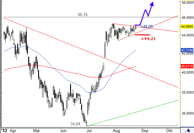 Die Aktie von Akzo Nobel startete nach einem Korrekturtief bei 34,84 Euro Ende Juni 2012 zu einer starken Aufwärtsbewegung, Diese führte die Aktie bis nahe an den Widerstand bei 46,16 Euro. Unterhalb dieser Marke lief der Wert einige Tage in einem kleinen Dreieck seitwärts. Aktuell versucht der Wert aus diesem Dreieck nach oben auszubrechen. Die Oberkante liegt bei 44,99 Euro. Gelingt der Ausbruch aus dem Dreieck, sollte die Aktie auch über 46,16 Euro ausbrechen und anschließend wäre eine Rally in Richtung 53,74 Euro möglich. Sollte der Wert allerdings unter 44,21 Euro abfallen, dann wäre eine größere Abwärtsbewegung möglich.