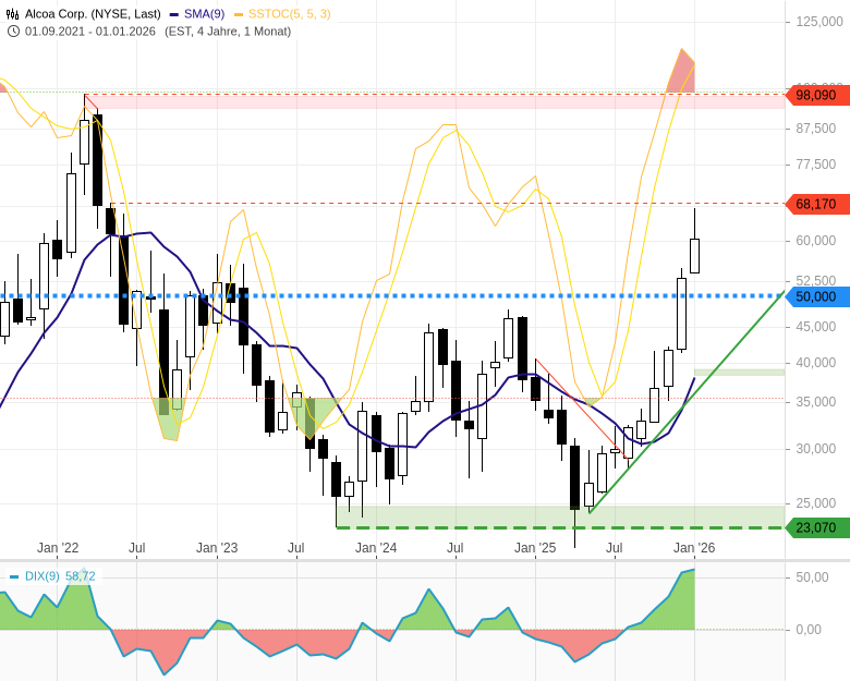 Chartisten sagen gern: Die Geschichte wiederholt sich. Allerdings nie eins zu eins. Während Anfang 2022 geopolitische Belastungen dominierten, könnte die Weltwirtschaft heute vor einem Comeback stehen. Eine mögliche Korrektur bei der Alcoa-Aktie würde idealerweise oberhalb von 50 USD enden. Der mittelfristige Aufwärtstrend bliebe damit voll intakt. Ein Ausbruch über 68,17 USD wäre hingegen ein starkes prozyklisches Signal. Auf lange Sicht halte ich sogar ein Kursziel im Bereich von 98 USD für möglich, auch wenn das ambitioniert klingt.