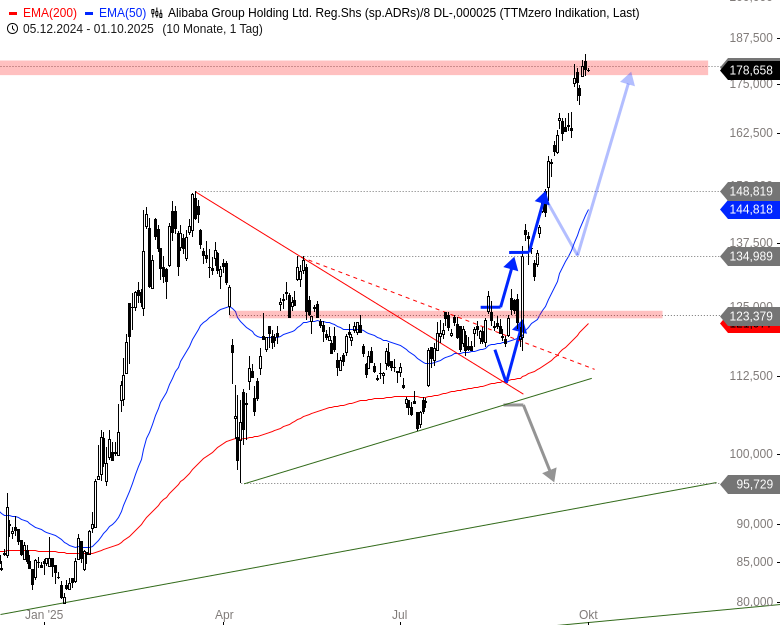 Im August zeigte sich Druckaufbau im Chart der Alibaba-Aktie, der sich erwartungsgemäß nach oben hin entladen kann. Der Wert erreicht das genannte Kursziel bei 178 - 181 USD. Nachfolgend die Prognose aus dem Chart Tracker vom 11. August: