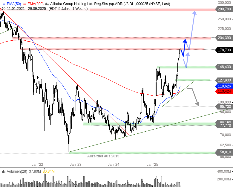 - Alibaba Group Holding Ltd. Reg.Shs (sp.ADRs)/8 DL-,000025Kursstand: 152,400 € (XETRA) - Zum Zeitpunkt der VeröffentlichungVerkaufenKaufen