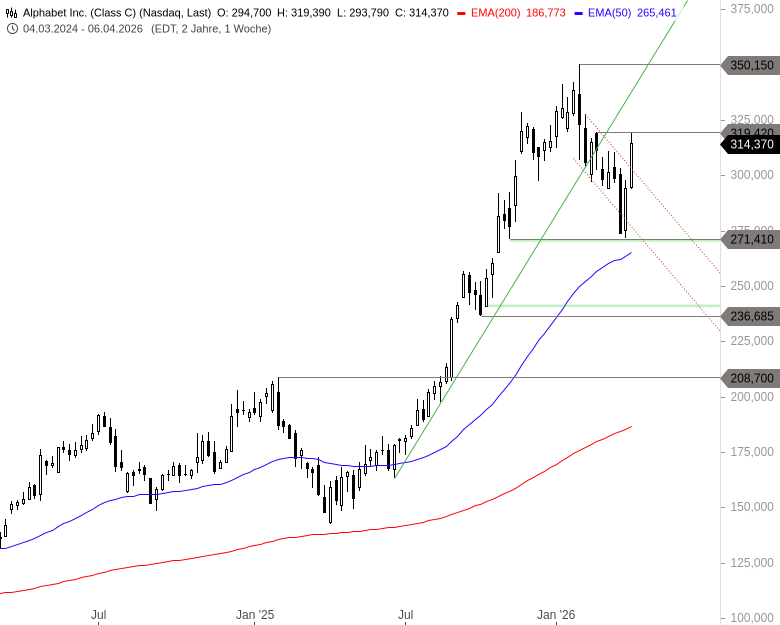 Charttechnisches Fazit: Der heutige Kurssprung trifft mit 319,42 USD direkt auf einen markanten Widerstand, der die Bullen bei den Anteilen von Alphabet bislang ausbremst. Erst über der Marke könnten die weiteren Hürden bei 325 und 332 USD erreicht, dort aber die Korrekturphase reaktiviert werden.