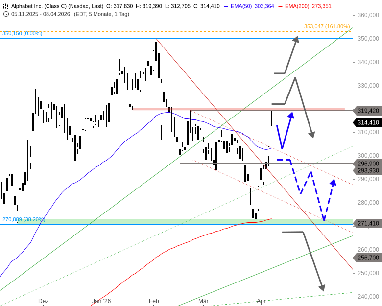 Am 31. März war es so weit und der Alphabet-Kurs markierte ein Tief bei 271,53 USD. Direkt am nächsten Tag startete an diesem idealen Korrekturziel die erwartet starke Aufholjagd, die zügig über die Hürden bei 293,93 und 296,90 USD führte. Gestern stoppte die Rallyphase noch an der Oberseite des skizzierten Abwärtstrendkanals.