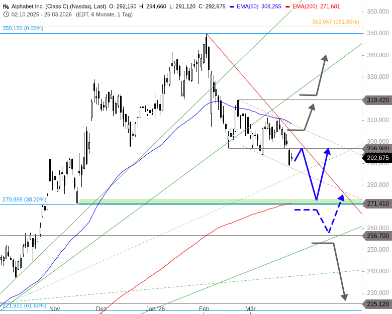 Sollte diese ungenutzt verstreichen, dürfte die Aktie von Alphabet an das zentrale Unterstützungsniveau bei 271,41 USD zurücksetzen und damit 38,2% der großen Kaufwelle seit April 2025 korrigieren. An dieser Kreuzung aus Fibonacci-Retracement, EMA 200 und zentralem Unterstützungstief könnte man nach Umkehrkerzen Ausschau halten und sich für einen neuen Aufwärtstrend auf die Lauer legen.