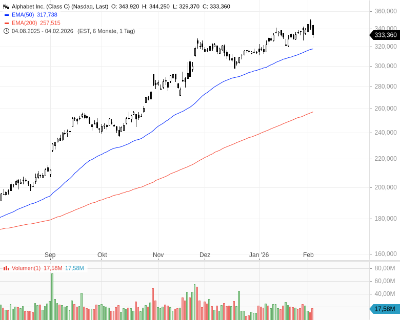 Fazit: Alphabet profitiert weiter vom rasanten Wachstum im Cloud- und KI-Bereich und hat die Erwartungen auch im vierten Quartal deutlich übertroffen. Die angekündigten Investitionen in Höhe von 175 bis 185 Mrd. USD sprengen sämtliche Erwartungen und dürften bedeuten, Alphabet hier alle anderen Unternehmen übertrumpfen kann. Ob sich die Investitionen irgendwann auch wirklich auszahlen, steht allerdings auf einem anderen Blatt. Angesichts der gigantischen Investitionen legen im nachbörslichen Handel auch die Aktien von Broadcom und NVIDIA zu, schließlich dürfte ein nicht unerheblicher Teil der gigantischen Ausgaben in KI-Chips fließen.