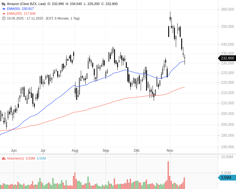 Fazit: Die hohen Investitionen gelten bei Analysten mittlerweile nicht mehr nur als Wettbewerbsvorteil, sondern auch zunehmend als Hindernis für eine hohe Bewertung. Wer viel investiert, hat weniger Geld, um es an die Aktionäre zu verteilen. Zudem steckt die Monetarisierung von KI-Anwendungen weiterhin in den Kinderschuhen. Kein Gamechanger für die Amazon-Aktie, aber zumindest heute ein Grund fallende Kurse.
