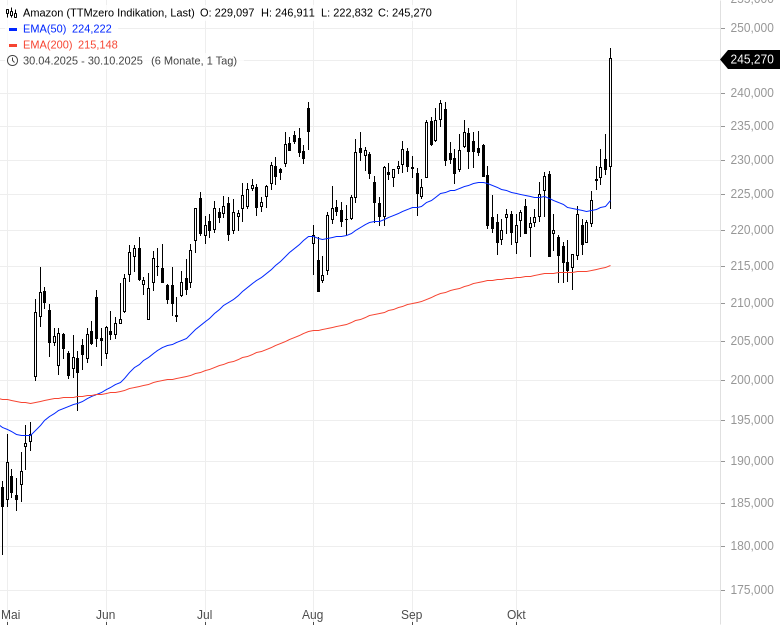 Für das vierte Quartal stellt Amazon einen Umsatz zwischen 206 und 213 Mrd. USD in Aussicht, entsprechend einem Wachstum von 10 bis 13 %. Beim operativen Ergebnis wird mit einer Spanne zwischen 21 und 26 Mrd. USD gerechnet. Beide Prognosen liegen im Rahmen der Analystenschätzungen.