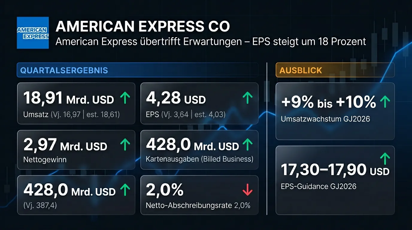 American Express hat im ersten Quartal 2026 einen Umsatz von 18,91 Mrd. USD erzielt und damit sowohl den Vorjahreswert von 16,97 Mrd. USD als auch die Analystenerwartungen von 18,61 Mrd. USD übertroffen. Der Gewinn je Aktie stieg um 18 Prozent auf 4,28 USD und lag damit deutlich über der Konsensschätzung von 4,03 USD. Das Nettoergebnis erhöhte sich auf 3,0 Mrd. USD, gegenüber 2,6 Mrd. USD im Vorjahreszeitraum. Das Kartenausgabenvolumen der Mitglieder wuchs um 10 Prozent auf 428 Mrd. USD – das stärkste Quartalswachstum seit drei Jahren. Für das Gesamtjahr 2026 bestätigt der Konzern seine Prognose eines Umsatzwachstums von 9 bis 10 Prozent sowie eines EPS von 17,30 bis 17,90 USD.