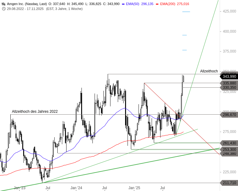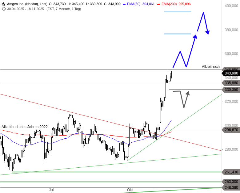 Bei 346,85 USD liegt das historische Hoch der Amgen-Aktie, welches am 25. Juli 2024 ausgebildet worden war. Seither dominierte eine mehrmonatige, dreiecksförmige Korrektur. Sie wurde im Oktober wie erwartet explosiv nach oben verlassen.