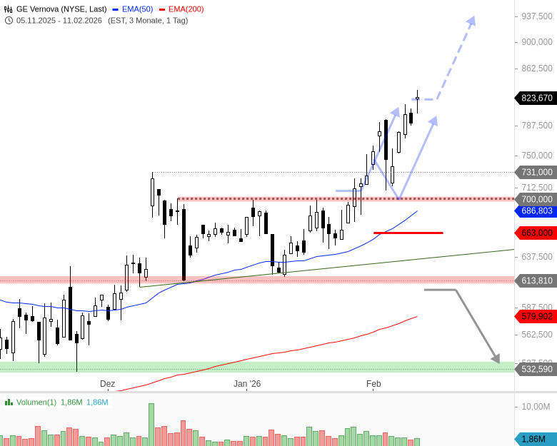 Das erste Tradingziel für einen Ausbruchstrade bei der GE-Vernova-Aktie wurde am 28. Januar bei 810 USD beziffert, in dieser Woche wurde es erreicht. Plus-Leser erhielten das Trading-Setup mit Zielen und Stop rechtzeitig vor dem Ausbruch. Teste auch Du unser Plus-Paket, jetzt sogar mit 10 % Rabatt:
