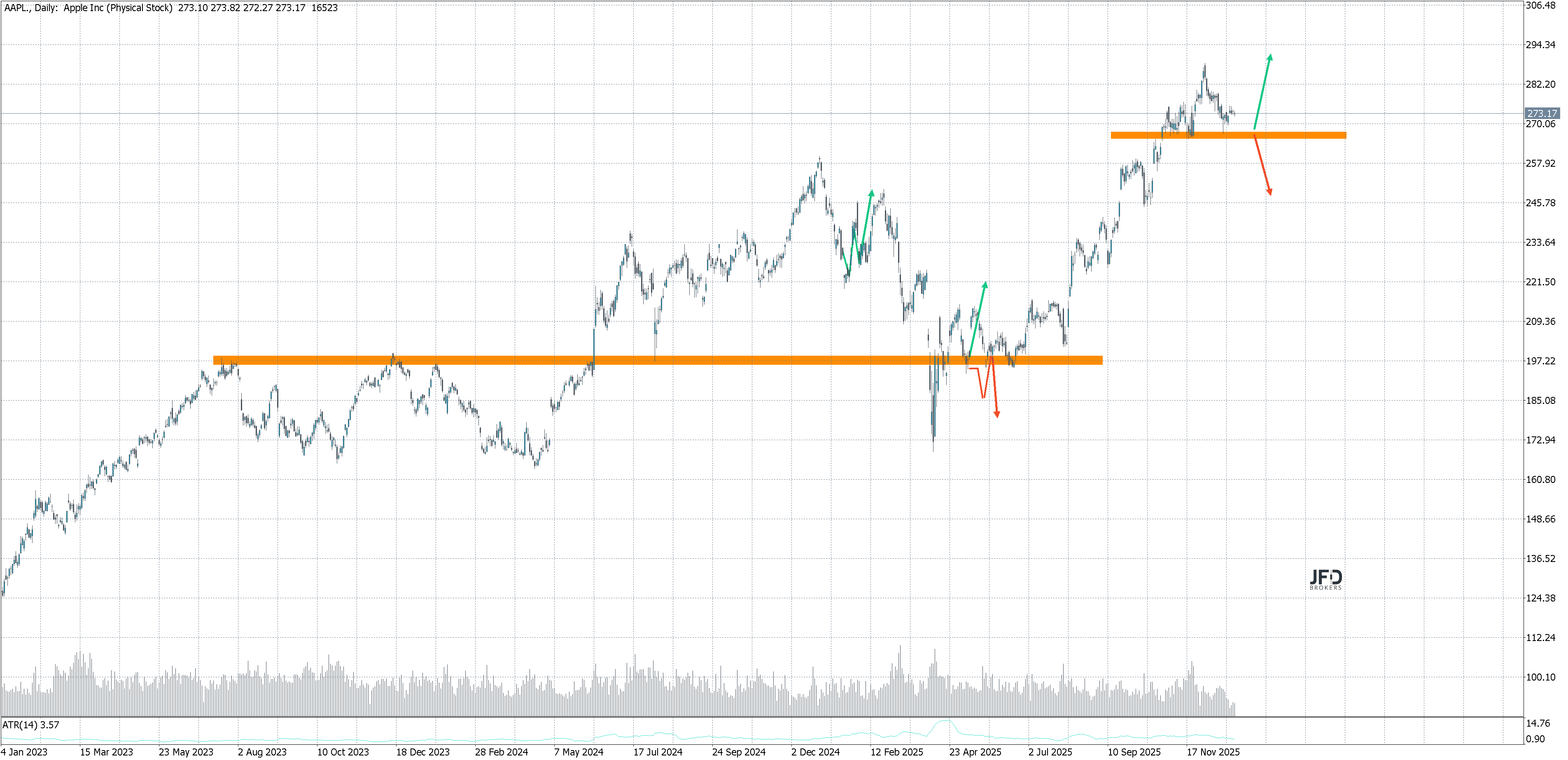 - Apple (AAPL) schloss das Börsenjahr 2025 deutlich über seinen Jahrestiefs, nachdem der Kurs im April bei rund 169 USD fiel und sich bis Ende Dezember nahe 273 USD stabilisierte – ein deutlicher Erholungs-Move über das Jahr hinweg.