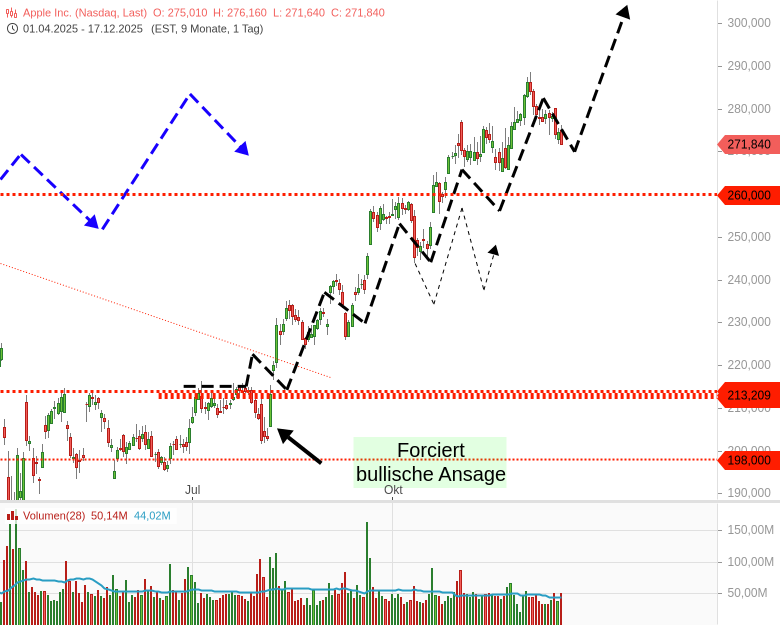 Chart1: Bereits am 5. August wurde die Aktie von Apple mittelfristig forciert bullisch vorgestellt, als viele andere Pfeile nach unten malten und die Stimmung in Bezug auf die Apple-Aktie schlecht war. Die bullisch Ansage kam auf stock3 PLUS, auf stock3 Plus stelle ich präzise Rallyansagen wie diese vor. Chart2 zeigt den aktuellen Stand. Die Aktie befindet sich wie angesagt, in einer mittelfristigen Rally mit bullischer Projektionszielkaskade in Richtung 304 USD. Apple bleibt der Dominator, der sich gerade neu erfindet: Weg von reiner Hardware, hin zur Fusion aus datenschutzsicherer KI, extrem profitablen Services und einer neuen räumlichen Computerplattform.