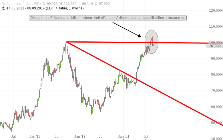 Apple. Der folgende Übersichtschart zeigt auf, dass die Aktie seit einigen Wochen im Bereich des Allzeithochs bei 100 $ steht. Ein erster kleiner Ausbruch wurde verkauft. Die Aufwärtstrendteilstrecke seit April 2013, die Ausdruck der Kraft der Käufer ist, steht dem 100 $ Widerstand gegenüber. Das kann normalerweise ersteinmal zu einer erhöhten Volatilität und Korrekturanfälligkeit führen.