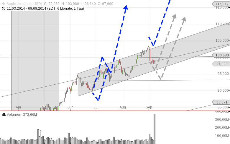 Wiederholung: "Sollte der Apple-Aktienkurs unter 96$ fallen, würde sich die Wahrscheinlichkeit für eine Korrektur erhöhen, die im Extrem bis 93 $ führen kann. Steigt Apple hingegen über 103,70 $, wäre dies mit einem mittelfristigen Kaufsignal mit Ziel 115 $ gleichzusetzen."