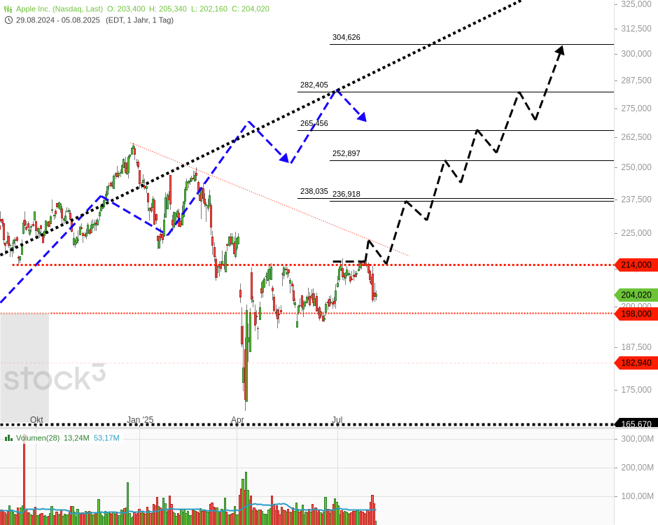 Chart1: Bereits am 5. August wurde die Aktie von Apple mittelfristig forciert bullisch vorgestellt, als viele andere Pfeile nach unten malten und die Stimmung in Bezug auf die Apple-Aktie schlecht war. Die bullisch Ansage kam auf stock3 PLUS, auf stock3 Plus stelle ich präzise Rallyansagen wie diese vor. Testet einfach kostenlos 2 Wochen und überzeugt Euch selbst. Der dicke schwarze Prognosepfeil visualisierte und visualisiert nach wie vor meine Prognose. Chart2 zeigt den aktuellen Stand. Die Aktie befindet sich wie angesagt, in einer mittelfristigen Rally mit bullischer Projektionszielkaskade in Richtung 304 USD.
