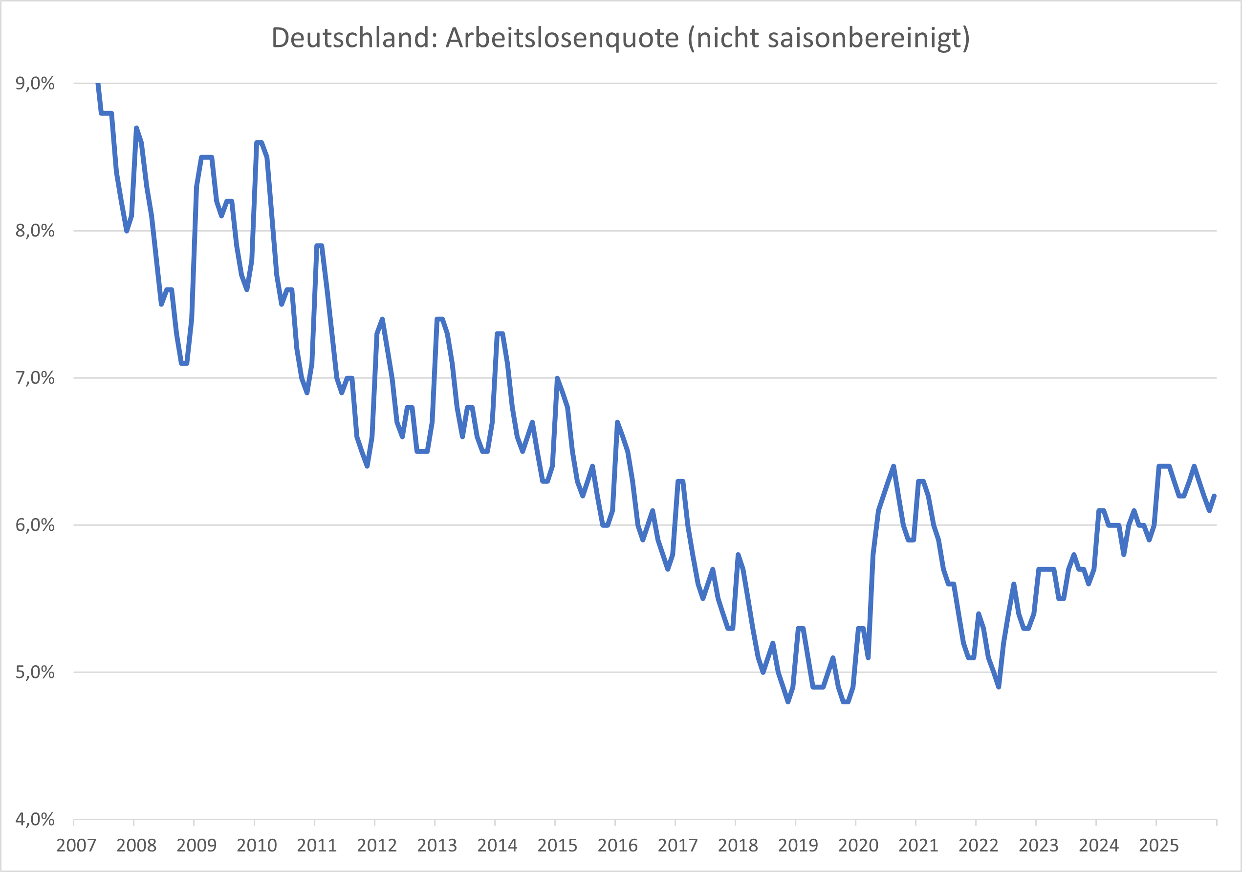 Im Dezember 2025 ist die Zahl der Arbeitslosen in Deutschland gegenüber dem Vormonat um 23.000 auf 2,91 Mio. Personen gestiegen. Die Arbeitslosenquote erhöhte sich auf 6,2 %, das sind 0,1 Prozentpunkte mehr als im November. Im Vergleich zum Vorjahresmonat lag die Arbeitslosenzahl um 101.000 höher, während die Quote um 0,2 Prozentpunkte stieg.