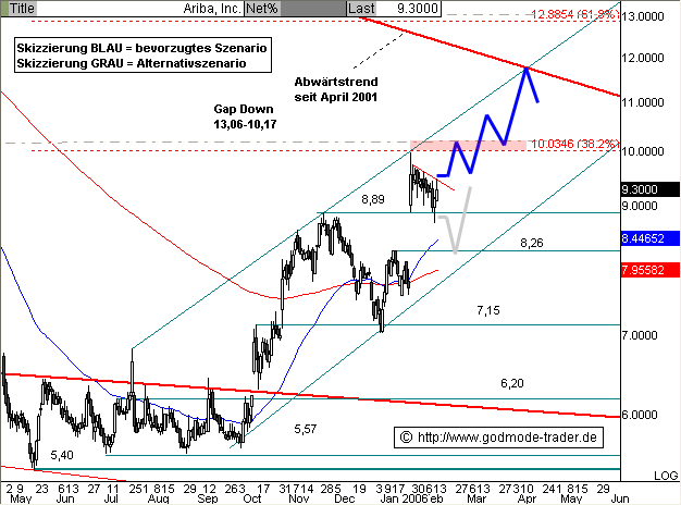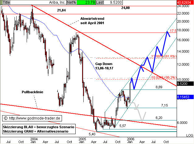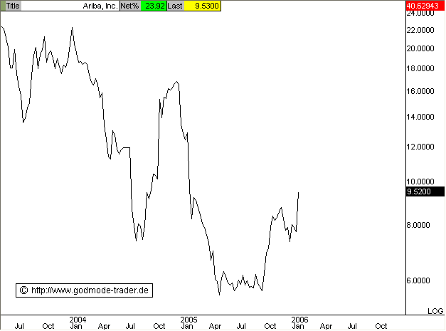 Diagnose: Die ARIBA Aktie markierte im März 2000 das AllTimeHigh bei 1100,06 $ und startete im September eine extreme Abwärtsbewegung bis September 2001, wo bei 13,20 $ ein Zwischentief markiert wurde. Seit dem läuft die Aktie seitwärts, wobei die Bewegung mit den tieferen Tiefs und tieferen Hochs einem Keil ähnelt. Im April 2005 rutschte die Aktie unter die untere Pullbacklinie, konnte sich nach einem neuen AllTimeLow bei 5,40 $ oberhalb von 5,57 $ stabilisieren und sprang im Oktober wieder dynamisch über die Pullbacklinie zurück. Damit wurde der Abwärtstrend vorerst gestoppt und eine deutliche Gegenbewegung nach oben eingeleitet.