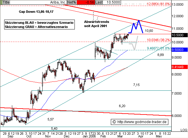 Diagnose: Die ARIBA Aktie befindet sich seit Oktober 2005 in einer Aufwärtsbewegung. Dabei übersprang die Aktie im Januar mit einemgewaltigen Gap Up das Novemberhoch bei 8,89 $ und korrigierte mehrere Wochen oberhalb von 8,89 $. Mitte Februar machte sich die Aktie wieder auf den Weg nach oben und tendiert aktuell unterhalb des Horizontalwiderstands bei 10,60 $ auf hohem Niveau seitwärts. Diese Seitwärtsbewegung hat bullischen Charakter und kündigt weiter steigende Kurse an.