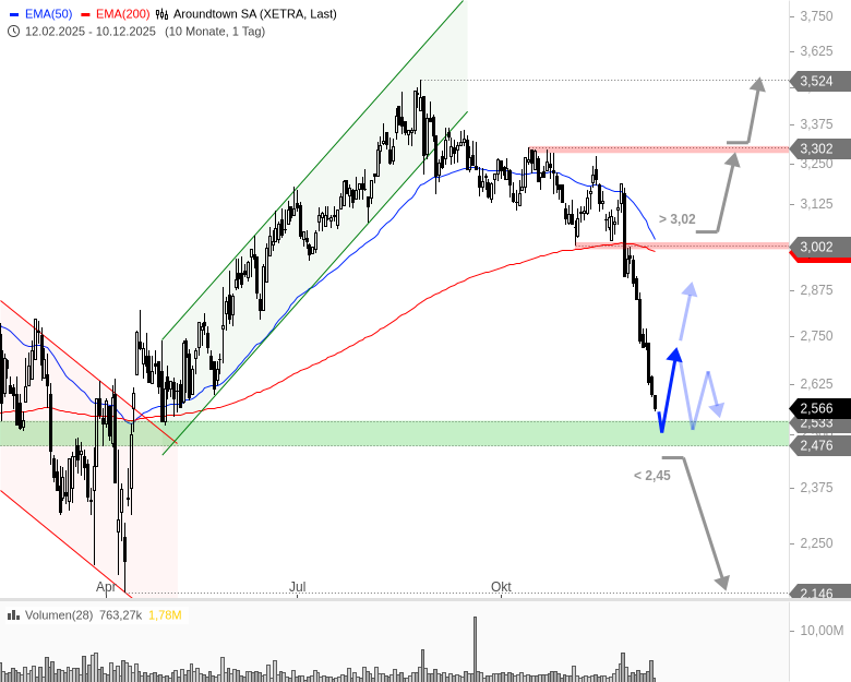 Bei 2,48 - 2,53 EUR liegt ein breiter Unterstützungsbereich, der mit der laufenden Verkaufswelle noch erreicht werden könnte. Dort bestünden dann Stabilisierungschancen, im besten Fall folgt eine technische Gegenbewegung auf die Kursverluste. Ob auch eine größere Trendwende möglich wird, bleibt offen.