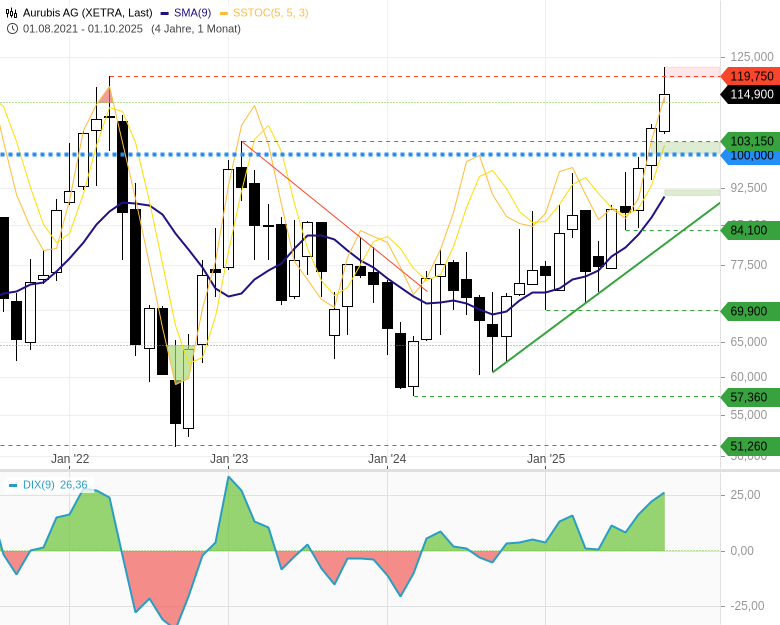 Die Aktie ist technisch überkauft, der Kurs gab im Mittwochshandel bereits über 6 % nach. Der DIX-Indikator (Abstand zur 200-Tage-Linie) liegt mit rund 25 % in der roten Zone; historisch ein Warnsignal für eine bevorstehende Korrektur. Entscheidende Support-Marke bleibt der Bereich um 100 EUR, wo erste Rückkäufe wahrscheinlich sind. Längerfristig bleibt die 200-Tage-Linie bei 86,20 EUR ein starker Halt.