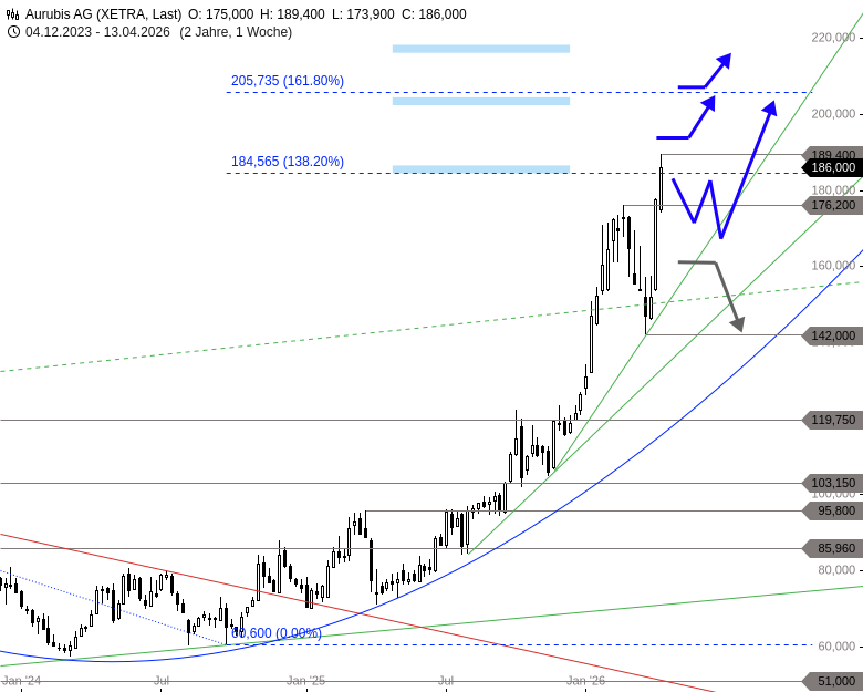 Charttechnisches Fazit: Die steile Rally der Aktie von Aurubis hat ein wichtiges Zielgebiet erreicht. Je schneller die Zone zwischen 184,56 und 193 EUR nach oben verlassen wird, umso deutlicher dürfte sich die Aktie später auch über die 200-Euro-Marke nach oben schrauben.
