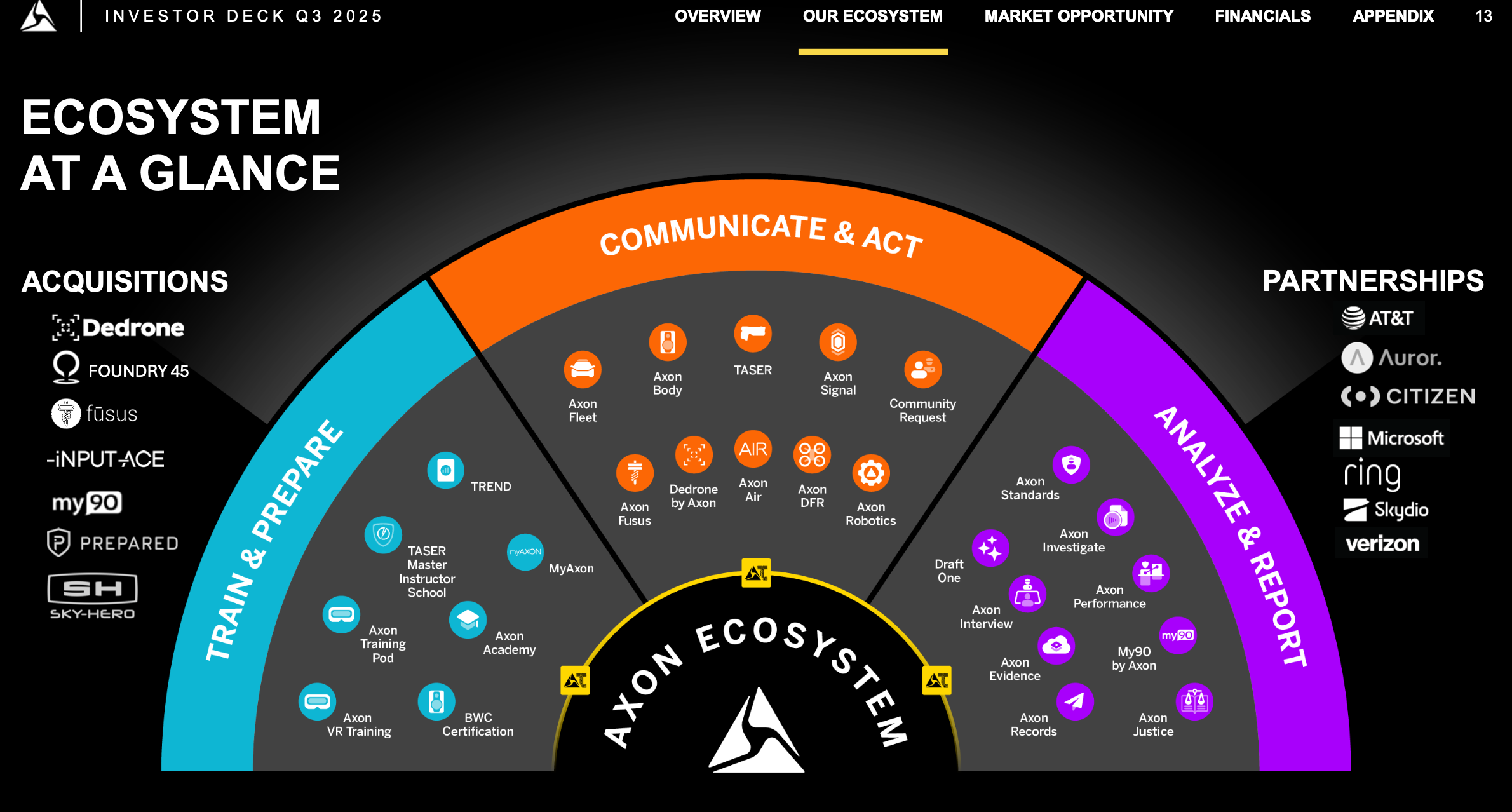 Dann die Akquisitionen von Prepared und die angekündigte Übernahme von Carbyne, die zusammen Axon 911 bilden und den addressierbaren Markt um fünf Milliarden Dollar auf 74 Milliarden USD im Bereich Emergency Response erweitern. Prepared liefert KI-Features, die sich auf bestehende Call-Taking- und CAD-Systeme aufsetzen lassen, während Carbyne eine vollständige Cloud-Native-Plattform bietet. Smith beschrieb die Strategie als Schritt, um an den Anfang jedes Notfalls (911) zu gelangen und von dort aus das gesamte Ökosystem zu orchestrieren.