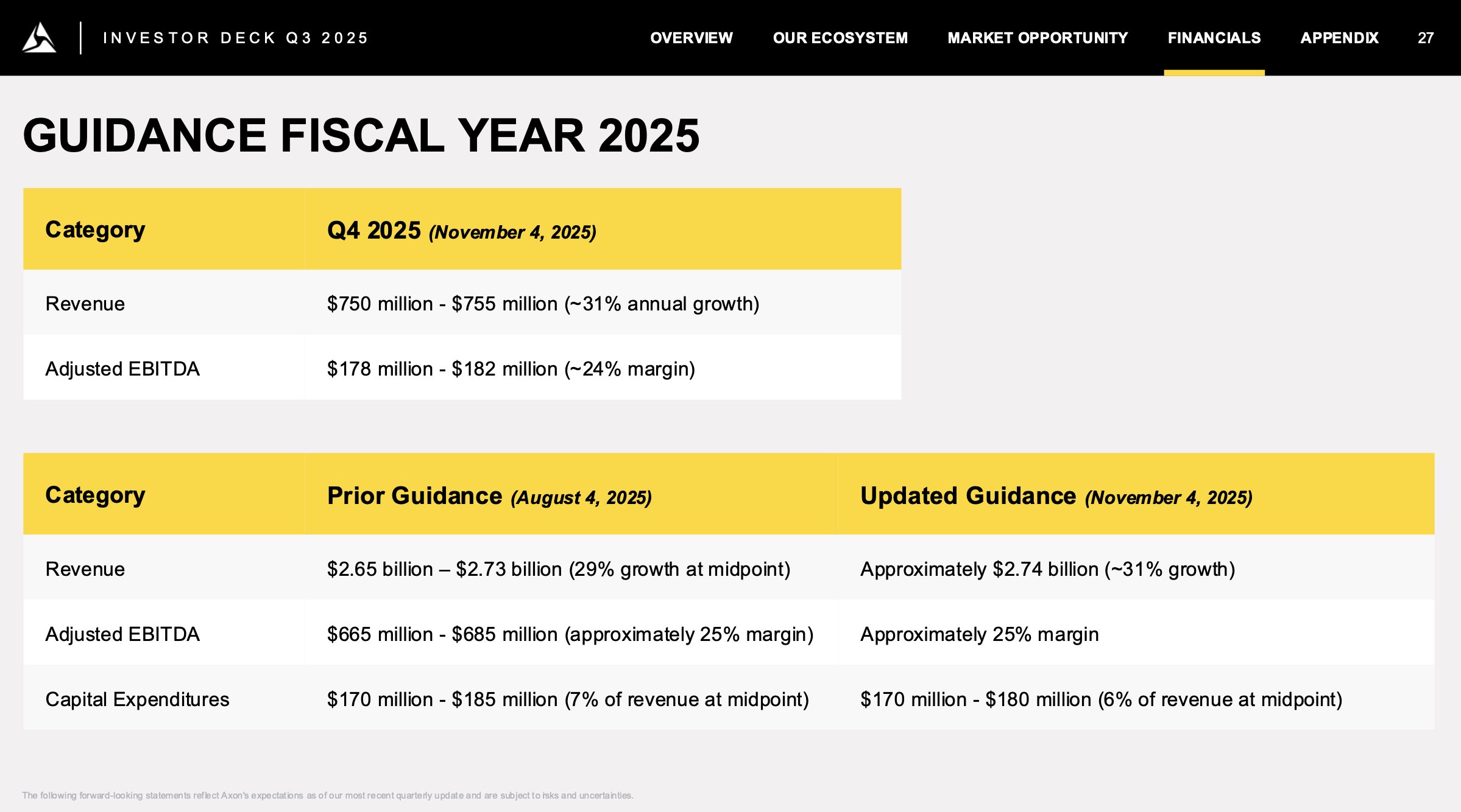 President Josh Isner betonte, dass "die Dynamik in den Bookings weiter zunimmt" und Axon bereits im laufenden Quartal mehrere Großverträge mit Laufzeiten über zehn Jahre abgeschlossen habe. "Selbst wenn wir auf fünf Jahre normalisieren, liegen die Wachstumsraten über dem Vorjahr". Die CFO zeigte sich auch sehr überzeugt, dass das Bookings-Wachstum in Q4 "noch stärker ausfallen" dürfte als im bisherigen Jahresverlauf. Sie verwies auf "hohe Visibilität" durch bestehende Verträge, eine "rekordhohe Pipeline" und wachsende internationale Nachfrage.