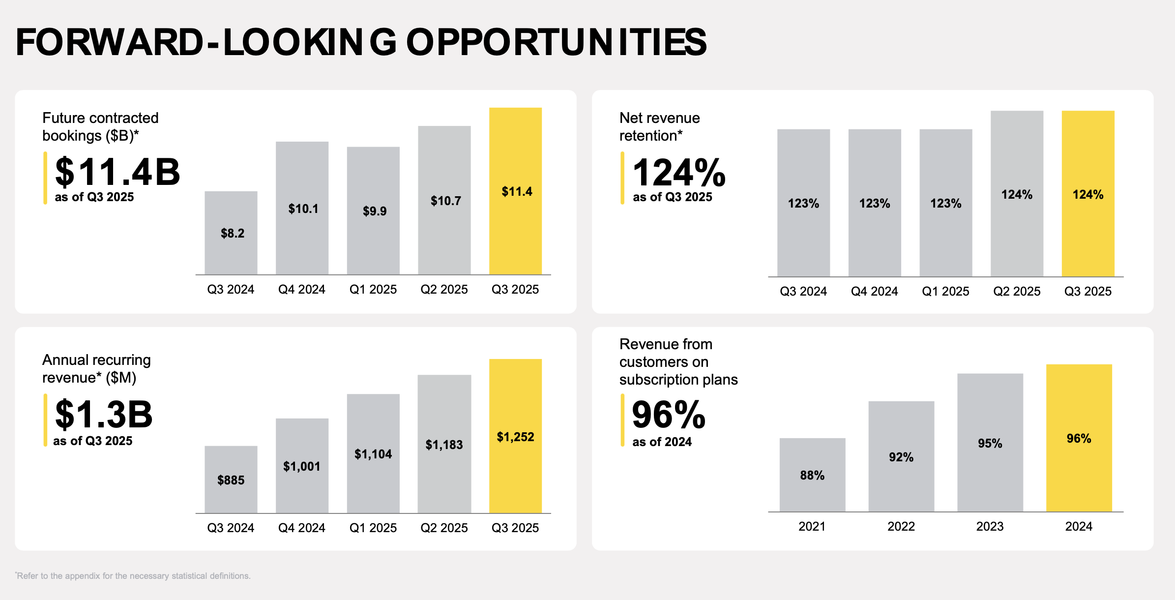 Das ARR (jährlich wiederkehrende Umsätze) beschleunigte QoQ auch das Wachstum und wuchs um 41 % auf 1,252 Milliarden USD, die Net Revenue Retention blieb stark bei 124 %. Die Future Contracted Bookings kletterten um 47,8 % % auf 11,4 Milliarden USD.