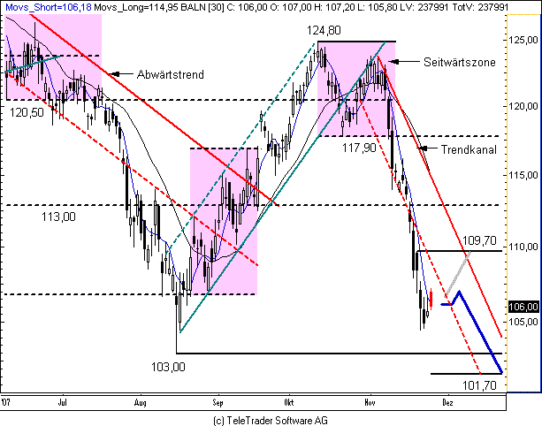 Rückblick: Am Tageschart von BALOISE erkennt man zunächst eine Abwärtsbewegung, die sich bereits im April 2007 zu bilden begann. Diese Bewegung führte im August schlussendlich zu einem Tiefkurs bei 103,00 CHF. Von dort aus stieg der Kurs jedoch innerhalb eines steilen Aufwärtstrendkanals auf bis zu 124,80 CHF, es folgte ine mehrwöchige Seitwärtszone. Seit der Ausbruch aus dieser Zone vollzogen wurde, geht es steil bergab.