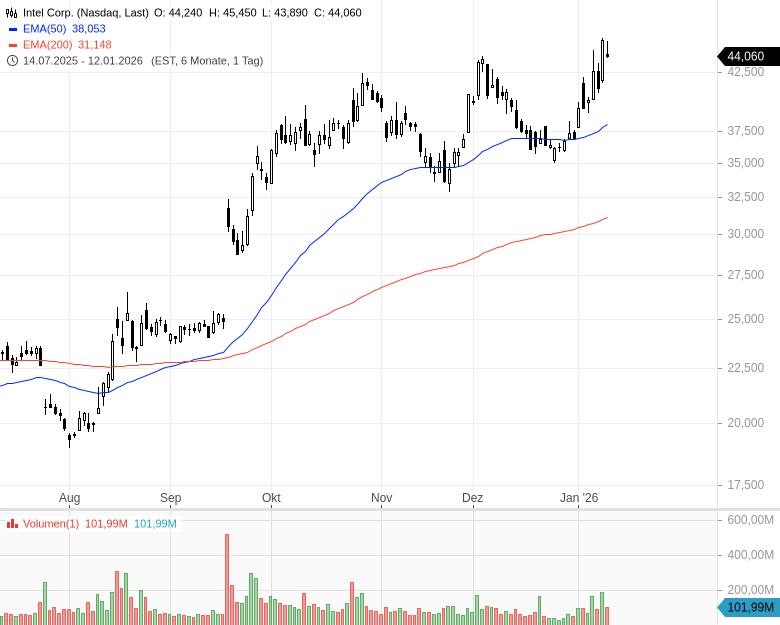 Die Aktie schloss zuletzt bei rund 111 USD. Zur gleichen Zeit sorgt ein optimistisches Votum für Intel für Aufmerksamkeit: Die KeyBanc hebt den Titel auf "Overweight“ mit einem Kursziel von 60 USD.