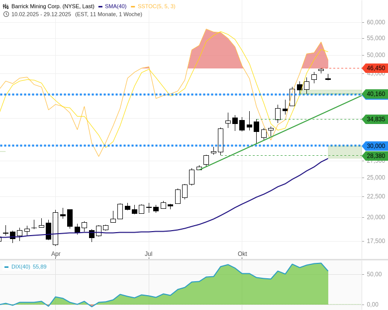 Eine Seitwärtsphase auf hohem Niveau würde helfen, die Übertreibung abzubauen. Entscheidend bleibt, dass sich der Kurs oberhalb von 40 USD stabilisiert. Zum Jahresstart zeigt sich der Goldpreis mit plus 0,9 % gut behauptet, auch die Barrick-Mining-Aktie startet fester in das neue Börsenjahr mit einem Plus von 0,3 % in New York. Das spricht eher für eine Konsolidierung als für eine scharfe Korrektur.