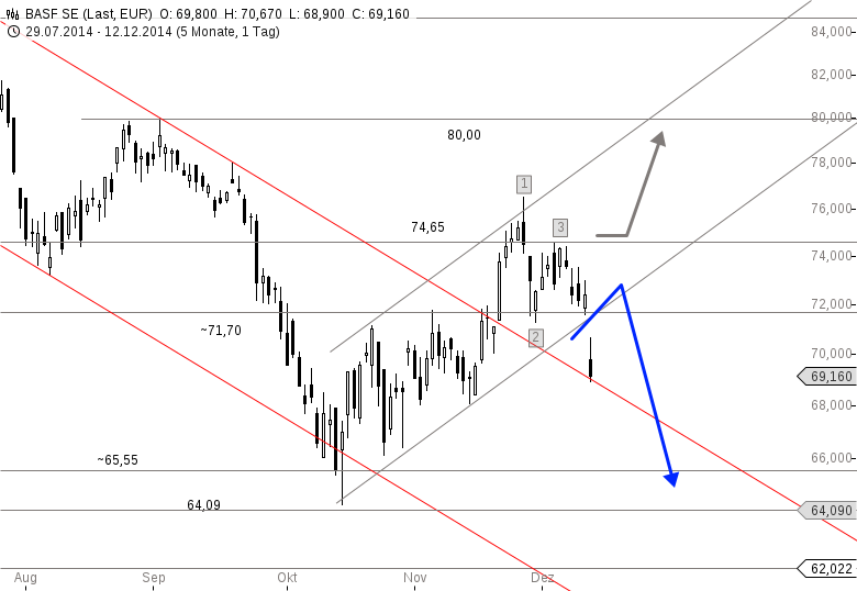 Der Traum von Kursen um 80 Euro in der BASF Aktie scheint vorerst ein Traum zu bleiben, denn am Freitag fiel die Aktie unter 71 Euro zurück. Damit zeigt sich im Chart jetzt ein kleines 123-Hoch, ein bärisches Toppmuster. Dieses hat durchaus das Potential, einen neuen Abwärtstrend zu starten, nachdem sich die Aktie ab Mitte Oktober ein wenig erholen konnte. Im Detail hieße dies, dass das Oktobertief im Unterstützungsbereich bei 65,55 – 64,09 Euro nochmals getestet werden könnte.