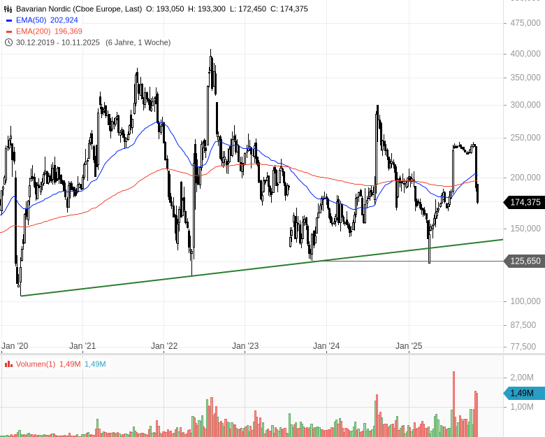 Für das Gesamtjahr liegt die Umsatz‑Prognose bei rund 6.000 Mio. DKK und die EBITDA‑Marge vor Sondereffekten bei etwa 26 %. Inklusive des Sonderertrags wird mit einer Marge von rund 40 % gerechnet. Damit bewegen sich beide Kennzahlen am unteren Rand der zuvor kommunizierten Zielspanne (Umsatz 6,0 bis 6,6 Mrd. DKK, Marge inkl. Sonderertrag 40 bis 42 %), was die Aktie heute erneut unter Druck setzt.