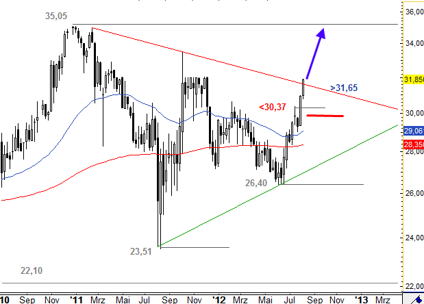 Die Aktie von Baywa startete nach dem Tief bei 28,26 Euro zu einer starken Aufwärtsbewegung. Diese führte die Aktie bis an den Abwärtstrend seit Februar 2011. Aktuell notiert die Aktie sogar leicht über diesem Trend, daher kommt es zu einem Ausbruchsversuch. Etabliert sich die Aktie nun über diesem Trend, der aktuell 31,65 Euro liegt, dann wäre eine weitere Rally in Richtung 35,05 Euro möglich. Sollte die Aktie unter 30,12 Euro abfallen, dann würden die Chancen auf einen baldigen Ausbruch deutlich sinken.