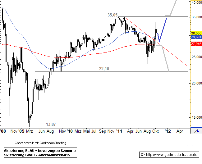 Das Jahr 2011 lief lange Zeit für die Aktie schlecht. Sie musste deutliche Verluste hinnehmen und fiel auf 23,51 Euro zurück. Damit näherte sich der Wert recht deutlich der wichtigen Unterstützung bei 22,10 Euro an, drehte aber knapp darüber nach oben ab. In der vorletzten Woche gelang der Aktie der Ausbruch über den Abwärtstrend seit Februar 2011. Dieser wurde in der letzten Woche mit einer langen weißen Kerze bestätigt. Die Aktie setzte sich von dem bei aktuell 28,25 Euro liegenden Trend nach oben an. Zu Beginn dieser Woche kommt es zu leichten Abgaben.